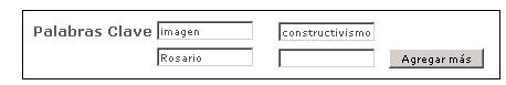 Por favor ingrese la cantidad necesaria de palabras clave para describir el ítem, de lo general a lo específico. Cuanto mayor sea la cantidad de palabras ingresadas, mayores posibilidades tienen los usuarios de encontrar el ítem en sus búsquedas. Use un casillero para cada tema, frase o palabra. Si desea agregar más casilleros seleccione "Agregar Más". Ejemplos: